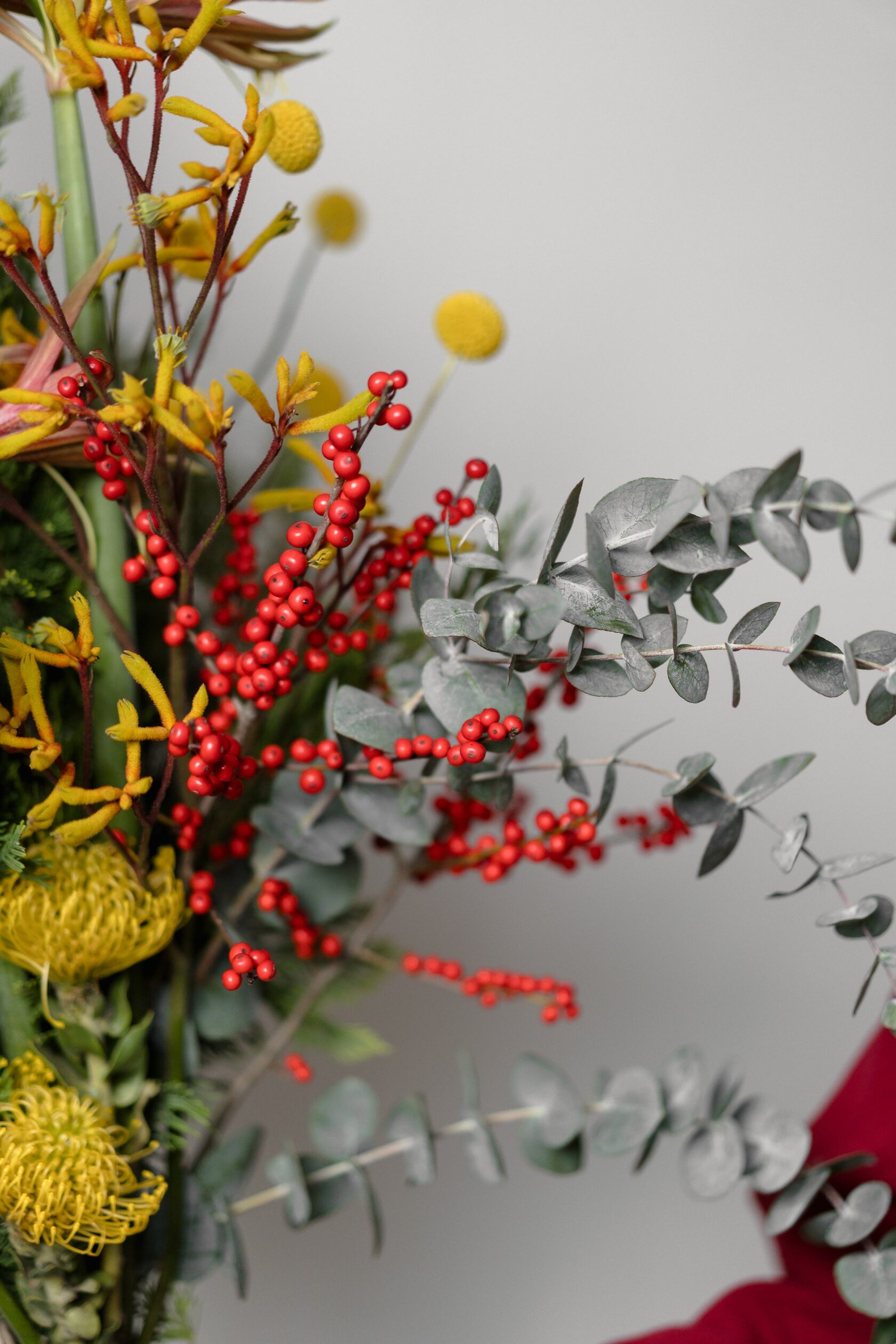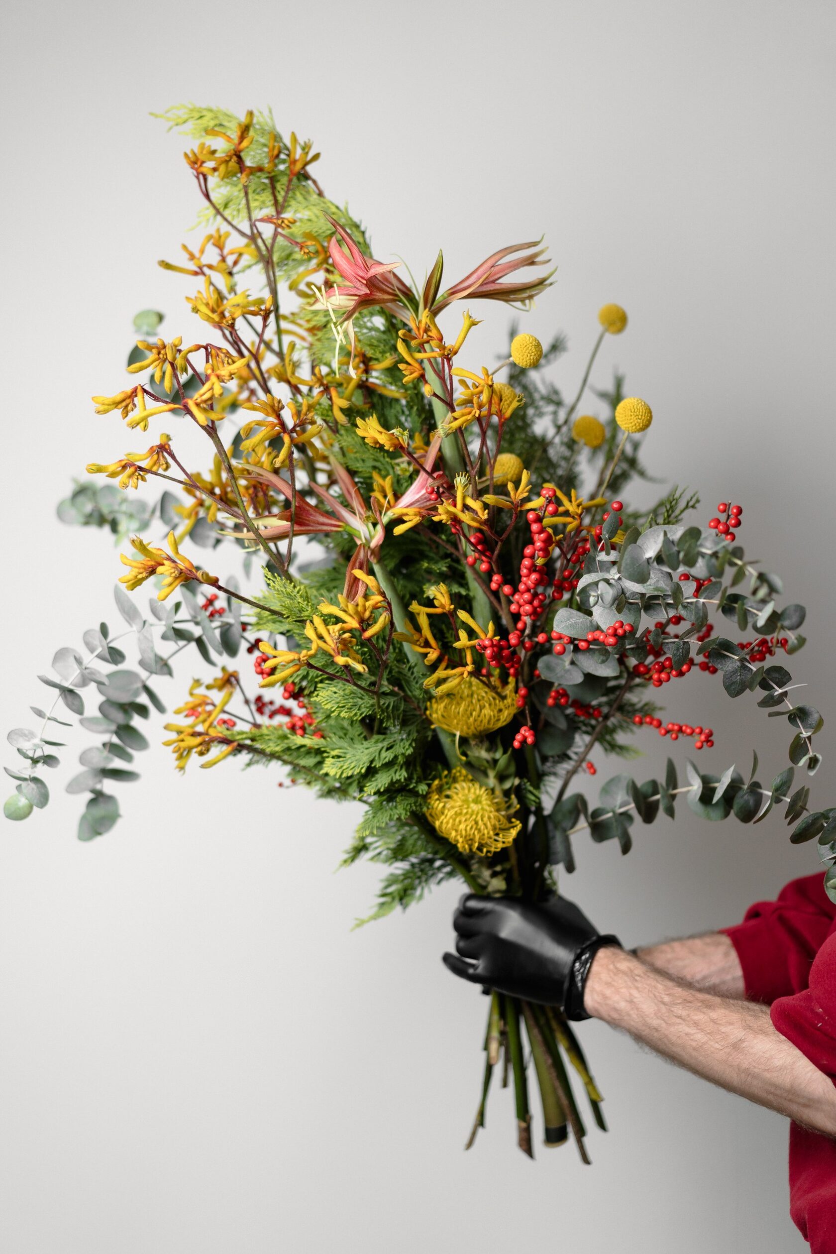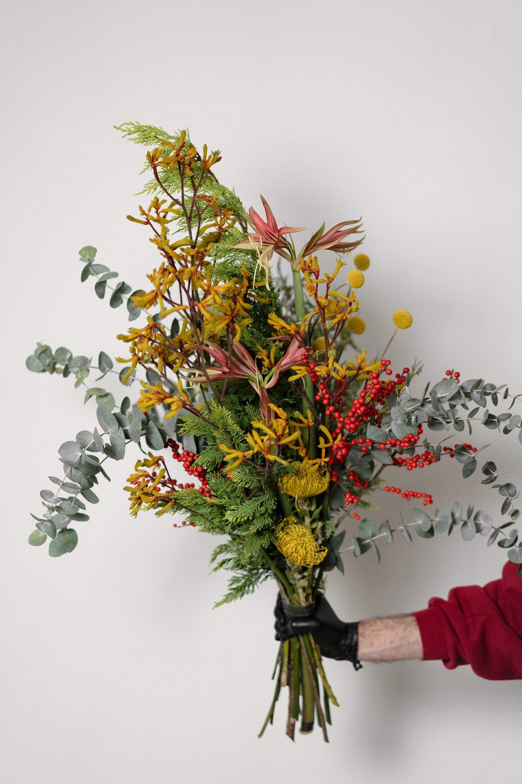 Хризантема Сантини - 5 шт. Эвкалипт - 2 шт. Хризантема одноголовая - 1 шт. Анигозантус - 2 шт. Кортадерия - 2 шт.